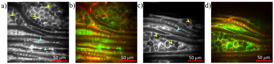 A slightly more intense SHG signal was detected when imaging deeper into the sample, as shown in the combined TPEF/SHG stacks (Figure 3b), which are reported in comparison to the corresponding greyscale images (Figure 3a). In this case, the SHG signal is confined to small spots and is probably located in the secondary cell walls of vessels. Weaker signals are distributed in the upper part of the analyzed area.