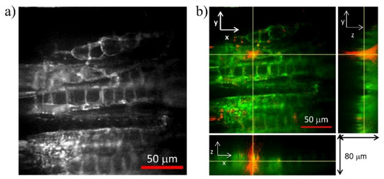 The SHG signal is also evident in the TPEF/SHG image stack with orthogonal views xz and yz (Figure 6b), acquired over a depth of 80 μm using an axial step of 1 μm.