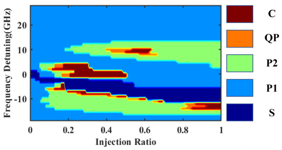 In order to find P1 operation regions, the dynamics of the optically injected DM laser in a parameter space of frequency detuning Δf and injection ratio ξinj are measured and plotted in Figure 3. In the map, the stable (S), P1, P2, quasiperiod (QP), and chaos (C) dynamics are denoted by dark blue, light blue, green, orange, and red, respectively. Two non-P1 regions over the injection parameter space of 4 GHz < Δf < 14 GHz and 0.2 < ξinj < 1 and −16 GHz < Δf < −8 GHz and 0.1 < ξinj < 1 are larger than those in DFB lasers [28], but P1 dynamic still dominates on the region above the Hopf bifurcation line.