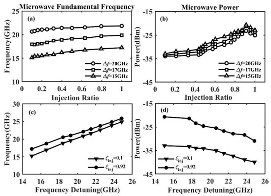(a) Frequency and (b) power of the generated microwave as a function of injection ratio; (c) frequency and (d) power of the microwave versus frequency detuning.