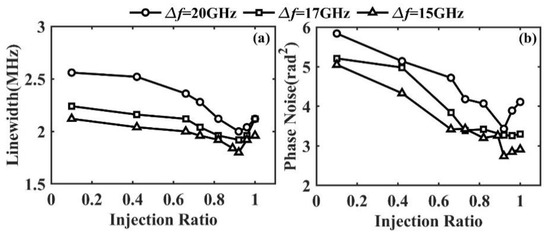 The quality of the generated microwave in the optically injected DM laser is examined by analyzing its linewidth and phase noise. A 3 dB linewidth is adopted to quantify the linewidth, and the phase noise is obtained by integrating single sideband power spectrum offset from 3 to 200 MHz of the fundamental frequency and then normalizing it to the microwave power. The linewidth and phase noise of the generated microwave shown in Figure 4a are calculated and displayed in Figure 5. We can see that the linewidth and phase noise of the generated microwave decrease first with the increase in ξinj until they reach their minimum values at an injection ratio ξinj of around 0.92, and upon a further increase in the injection ratio, the linewidth and phase noise of the microwave signal increase again. The minimum linewidth and phase noise of the generated microwave obtained at the injection parameters (Δf, ξinj) = (15 GHz, 0.92) are 1.8 MHz and 2.75 rad2, respectively. The microwave linewidths produced in the optically injected DM lasers are similar to those in DFB lasers [28] but narrower than those in VCSELs [35]. This is because DM lasers have very narrow linewidths [40]. Comparing Figure 5 with Figure 4b, we can see that the linewidth and phase noise of the generated microwaves reach their local minima at the injection ratio where the maximum microwave power is achieved; these results are identical compared to those reported in DFB lasers [28].
