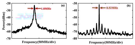 In order to stabilize the fluctuation of the generated microwave and reduce its linewidth, the optical feedback technique used in DFB lasers and VCSELs [28,44] is adopted. In this experiment, only a single feedback loop is introduced. Figure 6 presents the power spectra of the DM laser (a) without optical feedback and (b) with optical feedback at the injection parameters of (Δf, ξinj) = (15 GHz, 0.92). At these injection parameters, the fundamental frequency of the microwave is 17.2 GHz. As shown in Figure 6a, the linewidth of the generated microwave photonic signal is 1.8 MHz without optical feedback. After introducing the optical feedback, the linewidth decreases. Figure 6b shows that the linewidth narrows from 1.82 to 0.52 MHz when the feedback ratio is −27.8 dB and the feedback round trip time is 96.15 ns. Many side peaks equally separated by multiple of 10.4 MHz also appear in Figure 6b, which corresponds to the external cavity modes’ frequencies. To quantify the side peaks in the power spectrum, a concept of side peak suppression (SPS) is introduced and is defined as the ratio of the power at the fundamental frequency to the maximum power of the side peaks [43]. The SPS is around 28 dB, as shown in Figure 6b.