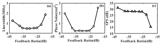 The effects of the optical feedback ratio on the linewidth, phase noise, and SPS of the generated microwave in the optically injected DM laser are studied and shown in Figure 7. The parameters in Figure 7 are the same as those in Figure 6b except for the optical feedback ratio. Figure 7a shows that the linewidth first decreases as the feedback ratio increases. When the feedback ratio is increased to −35.7 dB, the linewidth remains almost constant as the feedback ratio is further increased until the feedback ratio reaches −25.7 dB. Upon a further increase in the optical feedback ratio, the linewidth increases again. This variation trend is different from that in the DFB laser and VCSEL [28,35] but is similar to that in the DFB laser with filter feedback at some frequency detuning [45]. The relationship between the phase noise and the feedback ratio is similar to that of the linewidth. As the feedback ratio increases, the phase noise first decreases, then remains constant at around 0.3 rad2, and then increases again. Figure 7c presents SPS as a function of feedback ratio. When the feedback ratio is −42.7 dB, the SPS is 30.3 dB. The SPS starts to decrease first when the feedback strength increases, which is similar to that in the DFB laser and VCSEL [28,35]. However, after the feedback ratio increases to −35.8 dB, upon a further increase in the feedback ratio, the SPS remains almost constant at a value of about 28.3 dB until the feedback ratio reaches −25.7 dB. Beyond the aforementioned feedback ratio, the SPS decreases sharply. This is because the DM laser is about to leave the P1 dynamic. Figure 7 shows that the SPS remains above 25 dB within the feedback ratios where the linewidth and phase noise are kept to their minimum. The results indicate that a high SPS can be maintained over a wide feedback ratio range in the optically injected DM laser with a single optical feedback loop. The different variations shown in Figure 7 compared to those in DFB lasers and VCSELs may be attributed to the filtering effect caused by the structure of the DM laser, but further study is needed to fully understand the characteristics of DM lasers.
