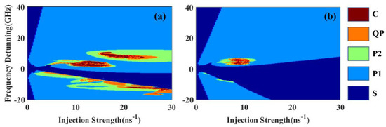 The dynamical map of the DM laser in the parameter space of frequency detuning Δf and injection strength η is presented in Figure 8a. The result is qualitatively consistent with the experimental measurements in Figure 3. To validate the model used in the simulation, we also simulated the dynamical map of the DFB laser using the model and parameters of [48], and the results are shown in Figure 8b. Figure 8b shows only one small non-P1 island within the P1 region above the Hopf bifurcation line, which is different from the experimental observation. Therefore, it is necessary to include the nonlinear carrier recombination for the investigation of the nonlinear dynamics of the optically injected DM laser.