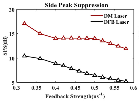 The SPS as a function of feedback strength for the generated MWP signal in the optically injected DM laser and DFB laser with single optical feedback is calculated and displayed in Figure 9. The injection parameters (Δf, η) are set at (15 GHz, 8 ns−1), and the feedback round trip time is 10 ns. Figure 9 shows that for the DM laser, the SPS is ~17.1 dB at the feedback strength of 0.32 ns−1. When the feedback strength is increased, the SPS starts to drop, and when the feedback strength reaches 0.4 ns−1, the SPS decreases to ~14.1 dB. However, when further increasing the feedback strength, the SPS remains almost unchanged until the feedback strength reaches 0.5 ns−1. When the feedback strength is increased further, the SPS starts to deteriorate again. However, for the DFB laser, the SPS decreases monotonically with the increase in the feedback strength. These results are qualitatively consistent with our experimental results in the DM laser and the reported results in the DFB laser, which indicates that single optical feedback is sufficient to achieve a narrow microwave linewidth in the optically injected DM laser.