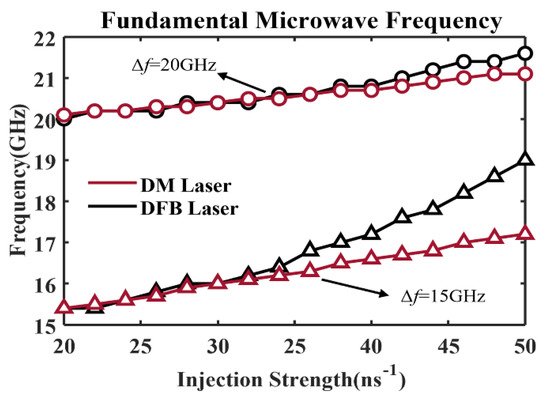 Numerical simulation of the generated microwave frequency as a function of the injection strength utilizing DM laser model and DFB laser model. Δf = 15 and 20 GHz.