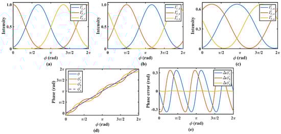 where can be also regarded as the amplitude of the -th harmonic, and . Clearly, the average fringe patterns described by Equation (13) have a similar Fourier series form as the distorted fringe patterns described by Equation (4). As illustrated in Figure 2c, the average fringe patterns have an approximate sinusoidal waveform. If we continue to use three-step phase-shifting algorithm to compute the wrapped phase, the nonlinear phase error can be approximated as: