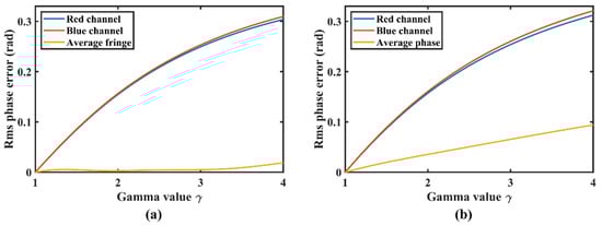 Moreover, we also explored the accuracy of the IDTP algorithm and the PDTP algorithm under different gamma values, . The color crosstalk was set as , , . Figure 5a illustrates the Rms phase errors of the IDTP algorithm. In contrast, Figure 5b illustrates the Rms phase errors of the PDTP algorithm. It is evident that the phase errors are almost proportional to the gamma value for both the IDTP algorithm and the PDTP algorithm. For the IDTP algorithm, the Rms phase error of the average fringe is very small, below 0.02 rad, even γ = 4.0. In contrast, for the PDTP algorithm, the Rms phase error of the average phase is larger, and close to 0.1 rad when γ = 4.0. These results confirm that the proposed IDTP algorithm can achieve higher accuracy than the conventional PDTP algorithm under different gamma values.