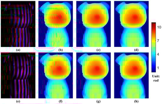 Secondly, the color crosstalk was considered, and we set , , , and . Figure 4a shows the color fringe generated by the IDTP algorithm. Figure 4b–d show the phase errors of the red channel, the blue channel, and the average fringe, respectively, and the Rms phase errors are about 0.2087, 0.2114, and 0.0045 rad, respectively. Figure 4e shows the color fringe generated by the PDTP algorithm. Figure 4f–h shows the corresponding phase errors of the red channel, the blue channel, and the average phase, respectively, and the Rms phase errors are about 0.2118, 0.2168, and 0.0505 rad, respectively. These results confirm the accuracy of the proposed IDTP algorithm compared with the conventional PDTP algorithm.