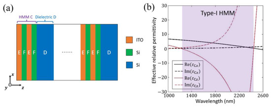 Here represents the filling ratio of the subwavelength ITO layer within the HMM. In the design, we select . According to Equations (12) and (13), we calculate the x and the z components of the effective relative permittivity tensor of the subwavelength ITO/Si multilayer (EF)2 as a function of the wavelength, as shown in Figure 4b. It can be seen that the type-I HMM conditions and are satisfied in the wavelength range from 1229.5 to 2445.6 nm (shown by the purple shadow region in Figure 4b). Hence, the subwavelength ITO/Si multilayer (EF)2 can be viewed as a type-I HMM in the wavelength range from 1229.5 to 2445.6 nm.