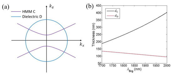 Clearly, the IFC of dielectric D is a circle, as schematically shown by the blue solid curve in Figure 5a. As the incident angle increases, the x component of the wave vector also increases, giving rise to the decrease in the z component of the wave vector within dielectric D . Therefore, we have . Since and , it is possible to realize according to Equation (3) [46]. It is known that represents the propagating phase within a single layer. Hence, is also called the phase-variation compensation condition [46]. When , the total propagating phase within a unit cell of the 1-D PCCH is insensitive to the incident angle. As a consequence, the Bragg wavelength satisfying the Bragg condition is also angle-insensitive, giving rise to an angle-insensitive PBG. To meet the phase-variation compensation condition, the thicknesses of HMM (C layer) and dielectric (D layer) should satisfy [46]