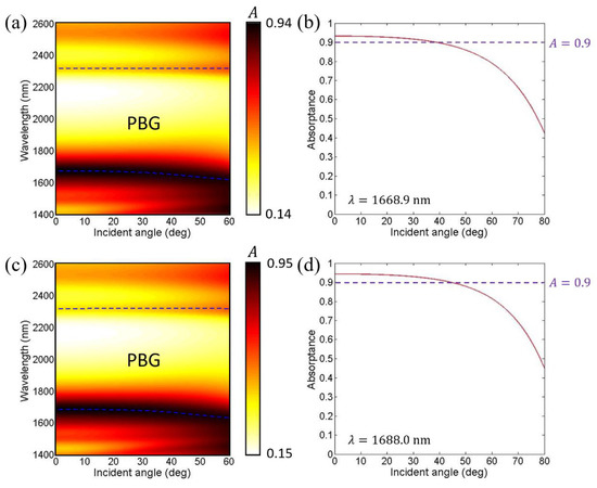 To further see the angle-dependence of two absorptance peaks, we also calculate the absorptance spectrum of the designed 1-D PCCH [(EF)2D]6 as a function of the incident angle under TM polarization, as shown in Figure 6c. The blue dashed lines represent the positions of two absorptance peaks. As the incident angle increases from to , the short-wavelength absorptance peak slightly shifts from 1702.0 to 1647.0 nm and the long-wavelength absorptance peak slightly shifts from 2362.3 to 2360.3 nm. The short-wavelength band edge shows a slight blueshift. The reason is that the approximate condition is not satisfied well at the short-wavelength band edge [46]. Compared with the absorptance peaks in the traditional all-dielectric 1-D PC (see Figure 2a), the absorptance peaks in the designed 1-D PCCH exhibit superior angle-insensitive property, which gives us an opportunity to achieve wide-angle absorption.