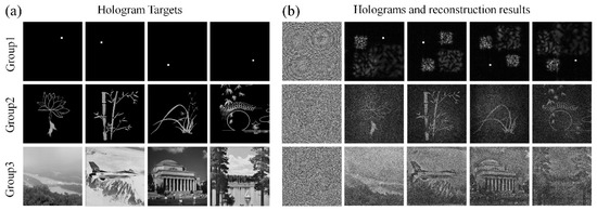Firstly, three holograms are designed to produce three groups of images as different holographic illumination (HI) to reveal the influence of hologram target image selection on the capability of phase retrieval. The images in Group 1 are simple and only contain one point with different positions. By contrast, the images in Group 2 and Group 3 are more complicated, in which the image of Group 2 contains more zero values. The distance between the hologram and the first projection plane is z = 100 mm. The sampling interval and resolution of the hologram are all the same with the object. The obtained holograms and their reconstructed images are shown in Figure 3b.