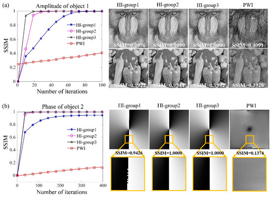 The iteration convergence curves and the reconstructed results of the two objects are shown in Figure 5. It can be clearly seen that as the number of iterations increases, three kinds of proposed HI converge much faster than the traditional PWI for both objects. After 100 iterations, the PWI can only reconstruct the contour of the rough object, but cannot recover the smooth vortex phase. Using HI, both objects are well retrieved. Among them, HI-group3 has the fastest convergence rate and the highest accuracy, followed by HI-group2, and then HI-group1. To quantitatively compare the results, Table 1 is presented. Mean normalized cross-correlation (MNCC) is introduced as a new parameter to represent the similarity of the diffraction pattern of the sample, which is defined by: