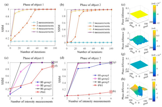 We also investigate the influence of the number of measurement planes on the reconstruction performance. Figure 6a,b show the phase convergence curves of object 1 and object 2, respectively, under different numbers of the captured diffraction patterns, and the HI-group3 is adopted. It can be seen that the number of the measurements is two, the captured intensities cannot provide enough redundant information for algorithm convergence. When the number of planes reaches more than three, the convergence of the algorithm can be ensured, and the more planes are used, the faster the convergence will be. In general, the convergence speed and imaging quality can be guaranteed by recording at least four planes. Figure 6c shows the phase convergence accuracy of object 1 under different illumination modes and different number of measurement planes after 100 iterations. We can see that with the increase of intensity measurements, the convergence accuracy is also improved. However, for plane wave illumination, the SSIM is still very low. It may be feasible to increase the number of planes, but it will increase the measurement time. Figure 6e shows the difference between the reconstructed and the ideal phase of object 1 using HI-group3, and the maximum error is 10−3 rad. In comparison, the maximum phase error is shown in Figure 6f with the PWI method is 1.0134 rad. For the vortex phase object, the reconstructed phase error using PWI shown in Figure 6h is up to 2.9818 rad, while the error by HI-group3 shown in Figure 6g is on the order of 10−9 rad, which proves the effectiveness of our method.