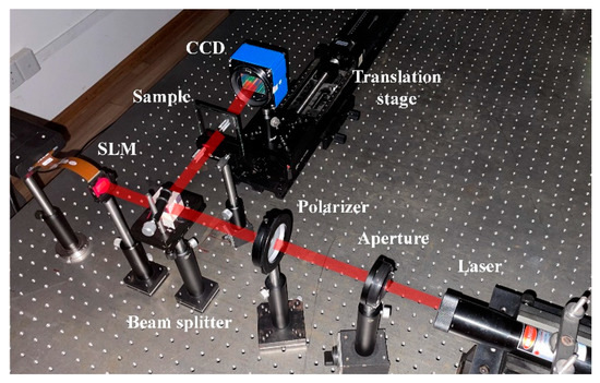 To further prove the effectiveness of the proposed method, the experiments are conducted and the imaging setup is shown in Figure 8. A laser parallel light tube with a wavelength of 658 nm is incident on the SLM (The HOLOEYE PLUTO VIS, 1920 × 1080 pixels with a pixel size of 8 μm) after being modulated by the aperture and the polarizer. A computer-generated hologram described above is loaded on the SLM, and the modulated light from the SLM illuminates the sample through a beam splitting prism, and then projects onto a CCD (The HR16000CTLGEC, 8-bit, 4896 × 3248 pixels with a pixel size of 7.4 μm). The CCD is mounted on a translation stage, moved with an interval step of 2 mm. Four diffraction intensity patterns are recorded. The initial distance between the sample and CCD is 90.3 mm, which is measured by the principle of grating diffraction [33]. The distance between the SLM and CCD is 200 mm, which is calibrated by the position of the clearest first holographic projection plane.