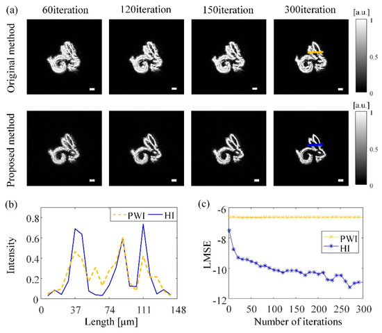 A “rabbit” pattern is firstly used as the amplitude sample, and the reconstruction results are shown in Figure 9. In Figure 9a, with the increase of iteration times, the original method using PWI always has problems of imaging blur, and the improvement of image quality is not significant. In the proposed method using HI, the calculation result of 60 iterations is visually better than that of the conventional method using 300 iterations. Meanwhile, the contour of the rabbit has been clearly formed at the beginning using HI, and increasing the number of iterations can effectively reduce the speckle noise. In order to quantitatively compare the two methods, the marked lines of the results of the two methods at 300 iterations are extracted and plotted in Figure 9b. It can be observed that the recovered result of the proposed method has a high imaging contrast. In addition, the logarithm of mean square error (LMSE) is adopted to evaluate the convergence performance of the two methods, which calculates the difference between the square root of the recorded intensity and the retrieved amplitude on the first plane. The lower the LMSE value, the better the reconstruction quality. The LMSE curves of the two methods are shown in Figure 9c, it can be found that with the increase of the number of iterations, the reconstruction error decreases with HI, while the reconstruction error is almost unchanged with PWI, which proves the effectiveness of our method.