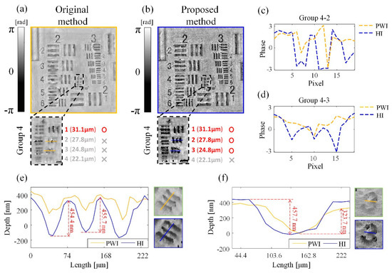 Secondly, a quantified phase resolution plate is tested to evaluate the ability to retrieve the smooth wavefront. The retrieved phase distribution of the sample with the traditional method and the proposed method are shown in Figure 10a,b, respectively. Group 4 is enlarged in the bottom and the cross-section phase distribution of groups 4-2 and 4-3 are plotted in Figure 10c,d respectively. It can be seen that the lines in group 4-1 with a resolution of 31.1 μm can be distinguished with the original PWI method. In contrast, the lines in group 4-3 with a resolution of 24.8 μm can be discerned with the proposed HI method. Moreover, in order to quantitatively evaluate the accuracy of phase recovery, lines recovered in group 3-5 and 3-3 are selected and corresponding phase values are converted into depth values. The phase value φ and the depth value h are related by: φ = 2πh(1.4565 − 1)/λ, where the constant 1.4565 is the refractive index of the phase plate. The real depth measured by the step profiler (Stylus Profiler System, Dektak XT, Bruker, Karlsruhe, Germany) is 477 nm. Two sets of depth data are shown in Figure 10e,f. Several retrieved depths marked by the red dashed lines using HI are 454.4, 455.7, and 457.7 nm. The depth error is about 4.5%, while the depth recovered by PWI is obviously much less than the true value and the depth error is larger. It is worth noting that the reconstructed results could be influenced by noises in the experiment, such as Gaussian noise, speckle noise, and Poisson noise. Besides, the displacement accuracy of the electric translation stage and the dark current noise of CCD will affect the imaging results. We will strive to overcome these defects in future work.