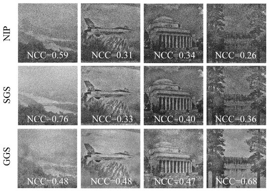 To date, there have been a number of hologram design methods for generating multiple planar images, such as noniterative projection (NIP), sequential GS (SGS) [34], global GS (GSG) [35], IFTA [36], non-convex optimization [37], binary optimization [38], and so on [39,40]. To reveal the influence of the hologram reconstruction accuracy on the multi-distance phase retrieval, three methods of hologram design are employed and compared. The parameters are the same as the simulation part and the iteration time in SGS and GGS is 100. Figure 11 shows the holographic reconstruction results. With the naked eye, the reconstruction results of NIP and SGS have large speckle noise. The results of GGS are clearer and have higher image contrast. From the value of NCC, the reconstruction accuracy from low to high is NIP, SGS, and GGS.