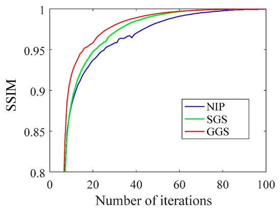 Then, the above three holograms are used as holographic illumination to reconstruct the sample (the vortex phase in Figure 2b). The iteration convergence curves are shown in Figure 12. It can be observed that all the methods can make the reconstruction algorithm convergence, and the convergence speed is only slightly different. In order to quantitatively compare the reconstruction performance, MNCC of light recordings, iteration time, and SSIM of the reconstructed sample are shown in Table 2. The hologram designed by the GGS algorithm can make the MNCC value of the recorded diffraction intensities as low as 0.0590. It means that the difference between the intensity is obvious, which can achieve a rapid reconstruction convergence rate, and it only takes 117 times to converge. While the NIP takes 140 to converge. It seems that using holograms with high reconstruction quality can realize fast phase recovery. However, the improvement is very slight. Therefore, it is considered that general methods can be used to design holograms for holographic illumination.