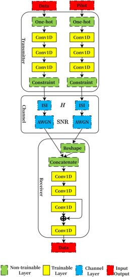 Here, we propose the NN framework in Figure 2 to solve the transceiver design issues in the above section. For the flexibility of the processing sequence, we leverage Conv1D layers in the AE model. To compensate for the varying ISI, the pilot sequence is creatively incorporated into the NN-based transceiver.