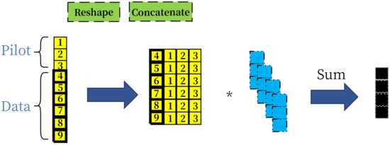 In the channel layer, both data and pilot sequences are firstly multiplied by an ISI Toeplitz matrix, whose row vectors are the shifted multipath channel vectors. Then, the noise generated from a standard normal distribution with a fixed variance , where SNR is the signal-to-noise ratio, is added into the distorted sequences.