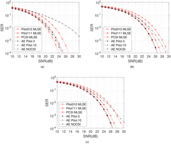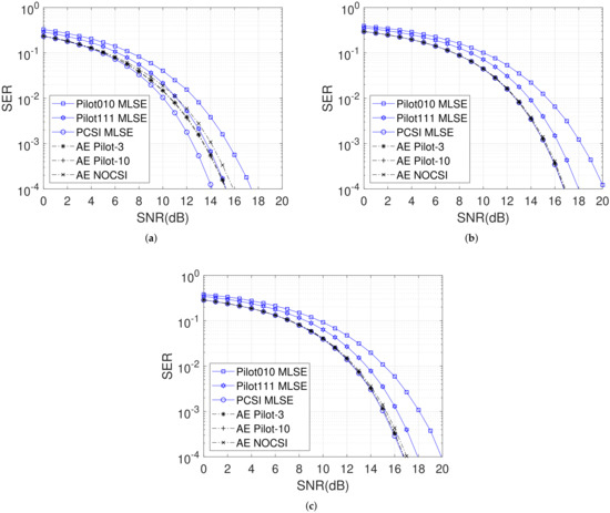 The AE results are slightly distinctive when . Similar to the case, the learned pilot sequence is . Nonetheless, the learned data constellation sets illustrated in Table 4 indicate that the constellation sets of schemes (Almost all the learned symbols in the sequence are mapped into the same constellation set. Only the last two or three symbols are mapped into different sets, but the values are still similar. Here, we only focus on the majority cases) using pilot converge to the equal-interval 4-PAM but the interval is irregular without CSI, which agrees with the PCSI and noisy CSI case in [20]. It can be seen from Figure 5 that the SER performance of ‘AE NOCSI’ significantly degrades compared with AE using pilot. Thus, the importance of CSI is obvious for above 2 level modulation. With the aid of the pilot sequence, the SER curve can approach the results of MLSE with PCSI in Figure 5b,c, which shows that the joint design of the transceiver using AE can reduce the power consumption with fewer pilot symbols to meet the desired SER performance. However, the performance is unfavorable in Figure 5a, similar to in Figure 4a, especially in the high SNR case, where the ISI occupies a more important position than noise. To handle these issues, one feasible strategy is to enlarge the pilot symbol number and leverage a deeper NN structure, which deserves a delicate experimental validation in our future work.