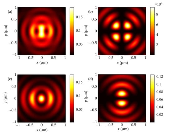 We note that Equations (1)–(4) differ from the equations obtained in [1], since the initial field (1) is polarized along the y-axis, whereas in [1] the initial field was polarized along the x-axis. Although the initial light field (1) has only one component Ey, Maxwell’s equations indicate that, upon light propagation, all three components of the E-field appear. If the light field propagates at a small angle to the optical axis, then the other two field components (Ex and Ez) are small and can be neglected. At tight focusing, the light propagates at large angles to the optical axis, so that all three components of the E-field (2) have a comparable value [15,16]. It can be seen from (4) that the intensity distribution Ix of the horizontal projection of the electric vector in the plane of focus has the form of four local maxima (light spots), the centers of which are located on a circle centered on the optical axis and lying on the rays emanating from the center at angles φ = π/4, 3π/4, 5π/4 and 7π/4.
