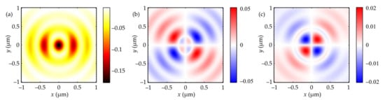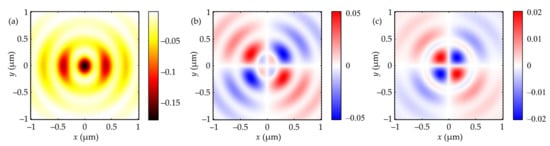 Certainly, near the tight focus, all 6 components of the E- and H-vectors (2) are significant, and none of these components can be neglected. Therefore, similarly to Equation (7), we can write expressions for the components Sx and Sy:
