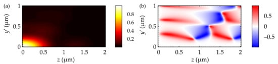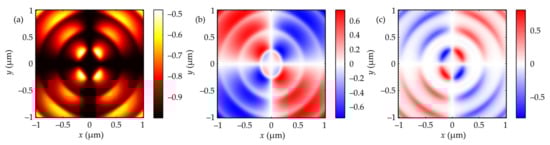 From Figure 8, it can be seen that simulating using the FDTD method confirms the results obtained using the Richards–Wolf formulas. In particular, Figure 8a shows that light is predominantly linearly polarized along the y-axis, and Figure 8c shows that quadrants 1 and 3 contain a right-handed circular polarization, and quadrants 2 and 4 a left-handed circular polarization.