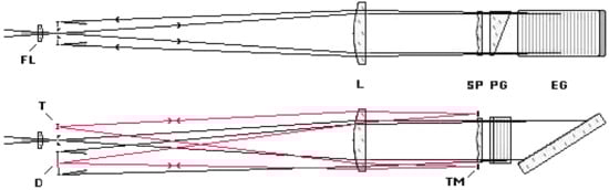 montage à pupille blanche, and provides the optical conjugation imaging of the pupils. The input pupil of the telescope primary mirror is reimaged at the diffractive element, and can be potentially reimaged by a successive image transport system from the previous dispersive element to the next dispersive cross element pupil. In most cases, the accurate pupil conjugation is achieved by a field lens. White pupil mounting spectrographs are widely adopted in astronomy.