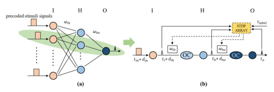 As shown in Figure 2b, external stimuli are firstly pre-processed into the precoded stimulus signals, and the center timing of the rectangular pulse is recorded as . The indicates the afferent delay of the precoded rectangular pulses to the input neurons. Each input neuron has only one afferent connection. For simplicity, we suppose that the neurons in the input layer can emit up to one spike. The spiking time of input neurons is recorded as . If there is no spike output for a neuron, the spiking time is recorded as T, which means the ending of the simulation time window.