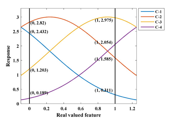 where is set to 1. As depicted in Figure 4, the horizontal coordinate represents real valued features, binary symbols “0” and “1”, for example. The vertical coordinate ranges from 0 to 3 ns. Then, each precise vertical coordinate is rounded to its nearest time step, which is set as 0.05 ns. The quantified result is recorded as (as presented in Figure 2b). Especially, if = 0 ns, the corresponding input neuron will not be stimulated; hence, it will fire at T. Moreover, for a given feature in a dataset, the maximum and minimum are known. According to Equations (14) and (15), parameters m and can affect the precoding result. The simulation results suggest that proper parameters m and are friendly to the network performance.