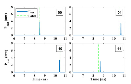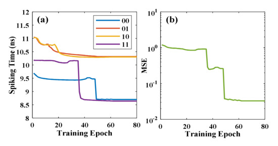 The architecture of the multilayer photonic SNN and learning algorithm applied are described in Section 2, where = 8, = 6, and = 1. The simulation time window is 0–12 ns, and T is 12 ns. The learning rate is set as 2.2. In simulation, the sample label 8.5 ns is expanded into the interval (8.3 ns, 8.7 ns), and label 10.5 ns is expanded into the interval (10.3 ns, 10.7 ns). If the prediction of output neuron falls inside the corresponding interval, it is considered right. Synaptic weights in the network are randomly initialized. After each training epoch, the training result and MSE (Equation (9)) are recorded. The training process converges when all the predicted results fall into the corresponding interval.