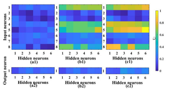 Figure 5a illustrates the firing time of output neuron in training. At the beginning, the network cannot output right predictions. With the synaptic weights modified, the network correctly predicts for the input patterns “01” (orange) and “10” (yellow) at about the 20th epoch. At about the 50th epoch, the network gradually achieves correct predictions of the input patterns “11” (purple) and “00” (blue). Finally, the learning process ends at the 60th epoch. Figure 5b presents the relationship between loss function MSE and training epoch, where the vertical axis takes logarithmic coordinates. It can be seen that the value of MSE drops and eventually converges at the 60th epoch. Figure 6 further presents the normalized synaptic weights over training epochs. Here, is calculated as , where () is the maximum (minimum) of the synaptic weights in training. The numbers indicate neuron index in different layers. As depicted in Figure 6a1,a2, the initial synaptic weights are random. Compared with Figure 6a1,a2,c1,c2, during the training process, many synaptic weights have been modified.