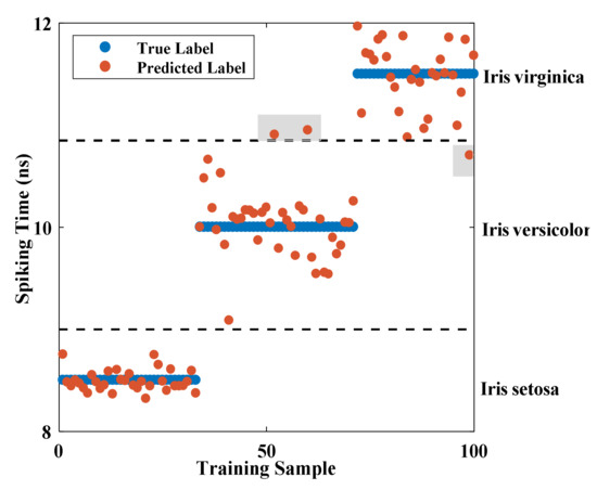 Predictions of the network on training set are depicted in Figure 8. Input patterns in the training set are randomized and predictions are re-sorted according to the true labels. The firing time of output neuron (orange circle) means the predicted label, and the blue circle means true label. The dotted lines at 9 ns and 10.85 ns are the boundaries of the true labels. Three time intervals [8 ns, 9 ns], [9 ns, 10.85 ns], and [10.85 ns, 12 ns] correspond to Iris setosa, Iris versicolor, and Iris virginica, respectively. As can be seen in Figure 8, all the Iris setosa samples are correctly predicted. As labeled by the shading parts in Figure 8, two samples of Iris versicolor and one sample of Iris virginica are not correctly predicted. The training accuracy is about 97%. That is to say, the predicting performance of the Iris setosa samples is better than those of the other two classes.
