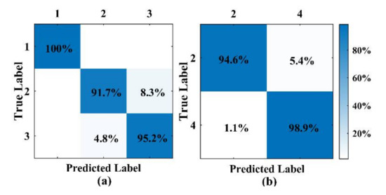 Figure 9a shows the normalized confusion matrix for test set of Iris dataset. The value in matrix indicates the average test accuracy. The vertical axis indicates the true label, and the horizontal axis indicates the predicted label. Numbers 1, 2, and 3 in the coordinate axes correspond to the three classes of Iris flowers: Iris setosa, Iris versicolor, and Iris virginica. It can be seen that all the samples that belong to class 1 are predicted correctly. For class 2 (3), 91.7% (95.2%) of the samples are correctly predicted.
