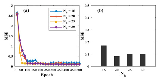 (a) MSE with different size of hidden layer as a function of training epochs. (b) MSE value corresponding to the converged training epoch.