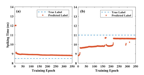 The spiking time of output neuron in the training process is depicted in Figure 11. Two different situations in the training process are illustrated. For most input patterns, as presented in Figure 11a, after some training epochs, the predicted labels come close to the true label, whereas for some input patterns, as shown in Figure 11b, the training process converges slowly. The predicted labels come close to the true label after several hundred training epochs.
