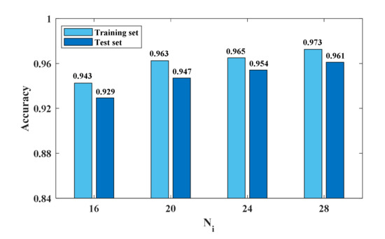 As can be seen in precoding, a larger input layer implies that the spiking times of the input neurons are presented in more dispersed distribution, and this may improve the network performance. Figure 13 shows the accuracy for multilayer photonic SNN with different sizes of input layer. These networks adopt the same dataset partitioning and the same size of hidden layer to ensure a fair comparison. It can be seen that both training and test accuracies are improved, as the grows from 16 to 28. Therefore, properly increasing the input layer size contributes to the network performance.