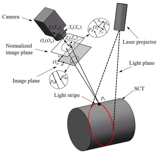 Schematic diagram of the model for the line-structured light 3D measurement based on a SCT.