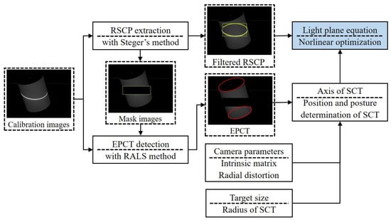 As the premise of this study, the camera intrinsic matrix and the radius of the SCT are known. The camera captures several calibration images. During the calibration-image processing, the RSCP are extracted and the EPCT are detected (see Section 3.1). Then, the axis of the SCT is determined by combining the two defined elliptical cones and the known radius of the SCT. Next, based on the constraint of two conditions—the camera model and the cylindrical equation—the coordinates of the RSCP in the CCS are solved (see Section 3.2) and finally nonlinearly optimized to generate the light-plane equation (see Section 3.3). The calibration flowchart is shown in Figure 2.