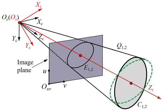 Subsequently, E1,2 and Oc can determine two elliptic cones, Q1,2, whose equations can be solved by using the back-perspective projection model of the camera and are described as