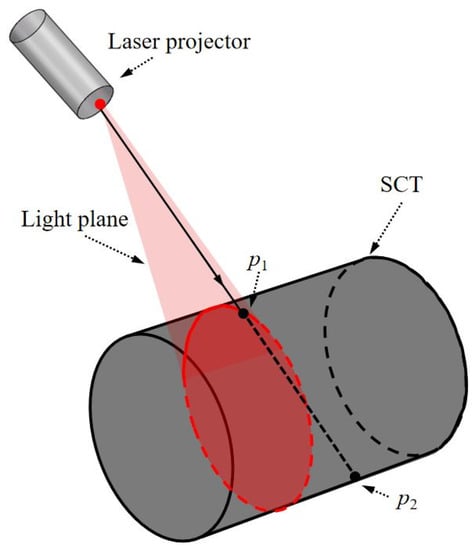 Essentially, Equation (20) expresses a cylinder equation. By combining Equations (19) and (20), the coordinates (xc,RSCP, yc,RSCP, zc,RSCP) can be solved. However, there is a phenomenon that needs to be highlighted and specifically addressed: From the geometric viewpoint, Equation (19) is a ray equation. If a ray intersects a cylinder, there should be two points of intersection (e.g., p1 and p2 in Figure 6). Obviously, one of both (e.g., p2 in Figure 6) is not in the light plane. In other words, if our proposed method is used directly, two solutions for p1 and p2 can be obtained, which will cause ambiguity.