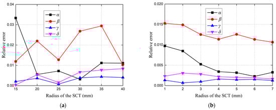 Gaussian noise (σ = 0.2 pixels) is incorporated into the simulated calibration images. The cylindrical target is placed twice, and its radius varies from 15 to 40 mm at an interval 5 mm. The relative errors of the coefficients and the average relative error at different target radiuses are presented in Figure 8a. The curves (especially the average relative error) show that the error decreases with increasing target radiuses from 15 to 25 mm, and is almost constant at a target radius above 25 mm. Therefore, considering economy, a SCT with a radius of 25 mm is manufactured and used in the physical experiment.