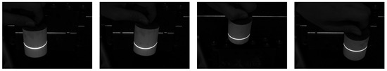 Then, the experimental system was calibrated with our proposed method. The cylindrical target was placed at the appropriate position four times. The calibration images are shown in Figure 11. We calculated the light-plane equations when the cylindrical target was at one time (one of four times selected) and four times, and their calibration results, respectively, are