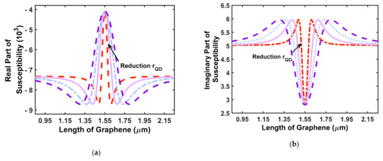 Figure 8a,b show the effect of the permittivity of the quantum dot on susceptibility by changing the material type. It can be observed that when quantum dots with a smaller dielectric coefficient are used, the amplitude of the susceptibility peaks decreases. The dielectric coefficient represents the degree of polarization of the material [2]. Materials with a higher dielectric coefficient will have a higher degree of polarization, and eventually, the field they induce will be larger [2]. It is worth mentioning that when changing the permittivity of the graphene, the induced field and the susceptibility of the QD will change in a manner similar to the previous case.