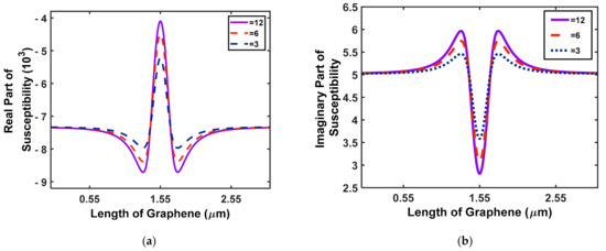 Susceptibility has two parts, real and imaginary (Equation (8)), which express the effective refractive index and absorption coefficient in the structure. Figure 5 considers three different values for the chemical potential, a quantum dot with a radius of 100 nm, and a dielectric constant of 12. Figure 5 shows that variation in the chemical potential has a negligible effect on the imaginary part, while its effect on the real part is significant. It can be seen that when varying the Fermi level or introducing electrons onto the surface of the graphene, the refractive index of the structure changes and is adjusted.