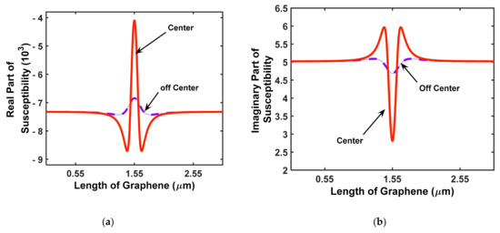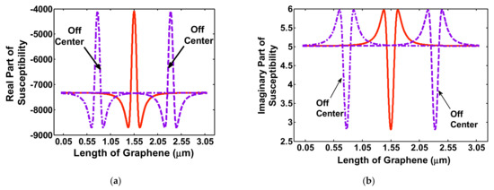 As shown in Figure 9, when the distance of the QD from the center of the graphene () nanoribbon increases, the susceptibility decreases. It should be mentioned that the maximum peak is displaced from the center of the nanoribbon to the center of the QD.