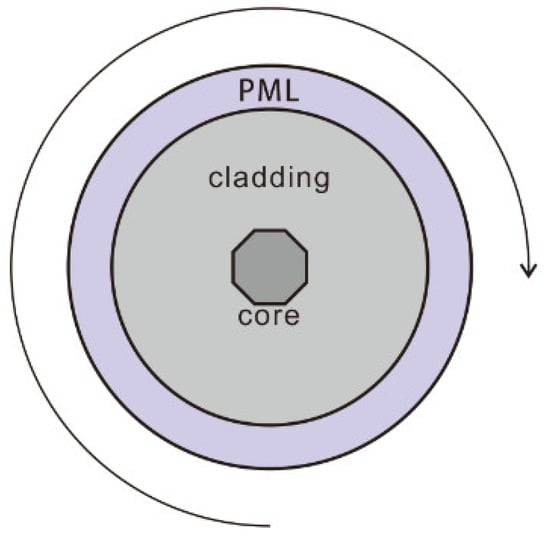 The perfectly matched layers (PML), surrounding the region of interest in helicoidal coordinates are used to rigorously calculate the propagation loss, shown in Figure 1. Numerical simulations of the twisted polygon-shaped core fibers are performed with a finite element method (FEM) implemented by Comsol software. The modal loss L in dB/m can be expressed as []: